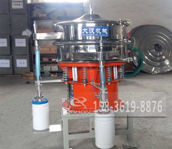 該設(shè)備是直徑600mm,一層兩個出料口,加有氣體保護裝置,與物料接觸部分是304材質(zhì),采用立式振動電機作為激振源,電機上、下兩端安裝有偏心重錘,將電機的旋轉(zhuǎn)運動轉(zhuǎn)變?yōu)樗?、垂直、傾斜的三次元運動,再把這個運動傳遞給篩面。
