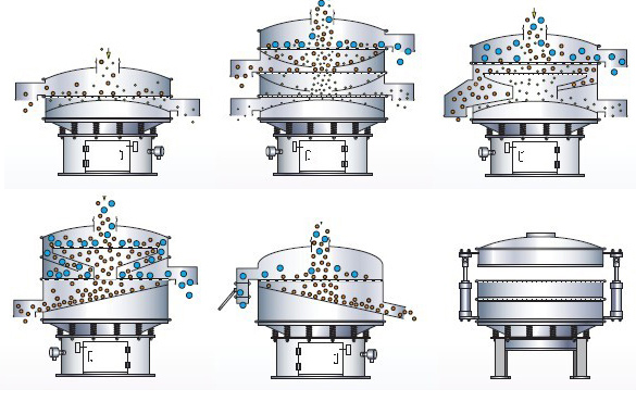 采用立式振動(dòng)電機(jī)作為激振源,通過(guò)振動(dòng)電機(jī)上下兩端的偏心重錘將旋轉(zhuǎn)運(yùn)動(dòng)轉(zhuǎn)變?yōu)樗?、垂直、傾斜的三次元運(yùn)動(dòng),并傳遞到旋振篩的篩面上;物料通過(guò)入料口進(jìn)入設(shè)備內(nèi),根據(jù)不同物料篩分要求,物料經(jīng)過(guò)1-5層采用不同目數(shù)的金屬編織篩網(wǎng)的篩分層,在這個(gè)過(guò)程中,位于各層的篩網(wǎng)下的清網(wǎng)裝置(硅膠彈跳球)通過(guò)頻率振動(dòng)不斷撞擊篩網(wǎng),使篩網(wǎng)上層物料能夠順暢的透網(wǎng)篩分,并有效解決了物料堵網(wǎng)問(wèn)題出現(xiàn),不同目數(shù)的物料通過(guò)各層對(duì)應(yīng)目數(shù)的篩網(wǎng)后在各層的出料口排出,終實(shí)現(xiàn)篩選除雜或過(guò)濾分級(jí)的目的。
